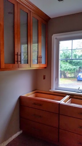 When the cabinet installer came, he was faced with how to get the pantry cabinets into the kitchen. We ended up opening a kitchen window, which was just wide enough to stuff the boxes through!